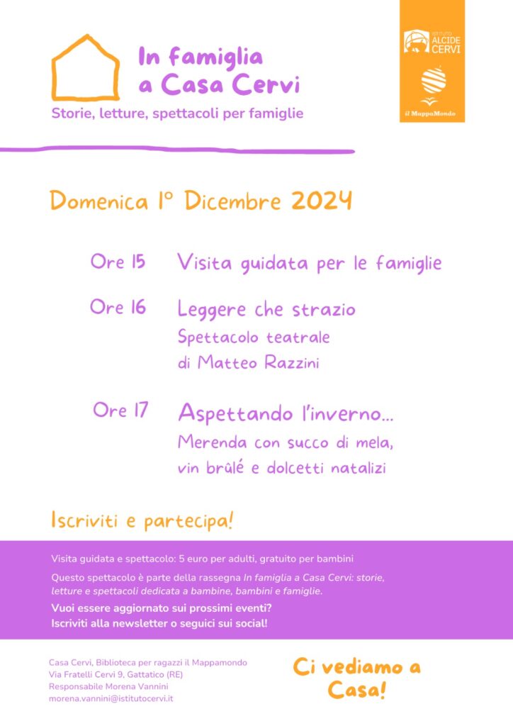 Domenica 1° dicembre si terrà il primo appuntamento della rassegna In famiglia a Casa Cervi, promossa dalla Biblioteca per ragazzi “Il Mappamondo” dell’Istituto Cervi.
